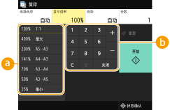 <原稿/分装类型>![]() | 通过使用 <A5->A4> 等预设复印倍率,或者通过以 1% 为增量设置自定义复印倍率,可以放大或缩小复印件。 |