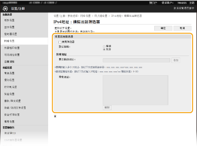 2 | 指定例外地址。 在 [要注册的地址] 文本框中输入 IP 地址(或 IP 地址范围),然后单击 [添加]。 检查是否有输入错误 IP 地址输入形式 | 说明 | 示例 | 输入单个地址 | IPv4: 用点分隔数字。 | 192.168.0.10 | IPv6: 用冒号分隔字母数字字符。 | fe80::10 | 指定地址范围 | 在地址之间插入连字符。 | 192.168.0.10-192.168.0.20 | 指定具有前缀的地址范围 | 输入地址,然后输入斜杠和表示前缀长度的数字。 | 192.168.0.32/27