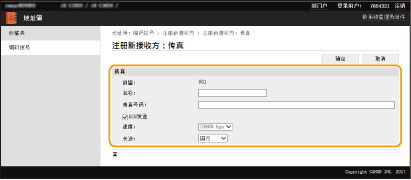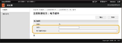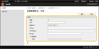 可以使用计算机在本机的地址簿中注册接收方,并编辑已注册接收方的信息。在此处指定共享文件夹或 FTP 服务器接收方。