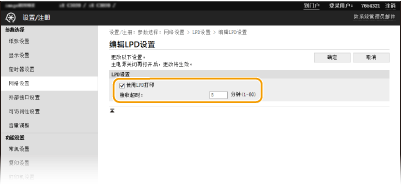 2 | 必要时配置设置。 ![]() [使用LPD打印] 选择此复选框可通过 LPD 打印。不使用 LPD 打印时,请取消选择此复选框。 [使用RAW打印] 选择此复选框可通过 RAW 打印。不使用 RAW 打印时,请取消选择此复选框。 [接收超时] 设置一个值作为数据接收的重启等待时间。如果在设定时间内数据接收没有恢复,则会取消打印。 |