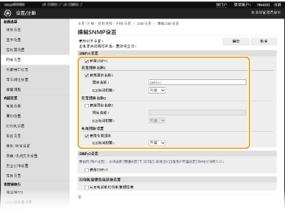 简单网络管理协议 (SNMP) 是用于通过管理信息库 (MIB) 监视和控制网络中通信设备的协议。本机支持 SNMPv1 和安全性增加的 SNMPv3。当您打印文档或使用远程用户界面时,可以从计算机检查本机的状态。您可以启用 SNMPv1 或 SNMPv3,或同时启用两者。根据您的网络环境和用途指定各版本的设置。