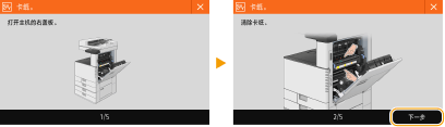 如果在指示发生卡纸的屏幕上按 <关闭>,则可以继续执行操作并指定设置,而不立刻清除卡纸。 不要从屏幕上显示的卡纸位置以外的地方取出纸张。这样做可能引起其他位置卡纸或丢失输出文档中的页。