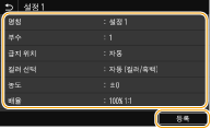 <예>를 선택하면 메시지가 표시됩니다. 메시지를 확인한 후, <확인>를 선택합니다. 등록된 설정 조합이 단축 버튼으로 홈 화면에 추가됩니다.