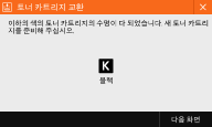 토너가 떨어지기 시작하거나 떨어지면 새 토너 카트리지를 준비하거나 토너 카트리지를 교체하라는 메시지가 표시됩니다. 표시된 메시지에 따라 새 토너 카트리지를 준비하거나 토너 카트리지를 교체합니다.