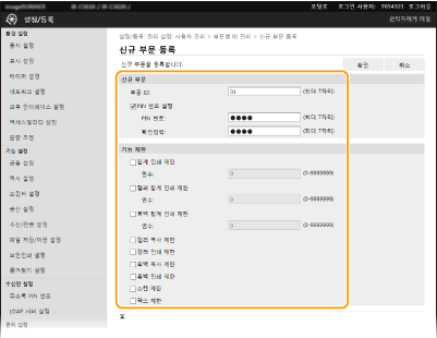 부서 ID를 등록하고 해당 ID에 대해 PIN을 설정합니다. 관리할 모든 부서 ID를 등록하십시오.