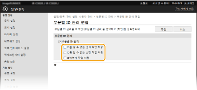 컴퓨터에서 작업에 대해 부서 ID 관리 활성화). 그러나 이 설정에 대해 확인란이 선택된 경우 ID와 PIN을 입력하지 않아도 작업을 수행합니다. 정확한 부서 ID와 PIN을 입력하지 않을 경우 작업이 수행되지 않도록 설정을 구성하려면 확인란을 지웁니다.