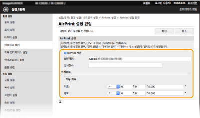 기기 이름 및 위치와 같이 AirPrint 설정에 입력된 값을 확인할 수 있습니다. [편집]을 클릭하여 설정을 변경할 수 있습니다.