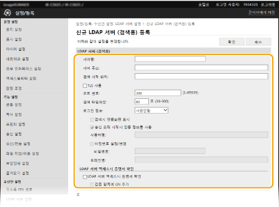 [LDAP 서버 (검색용)] 또는 [LDAP 서버 (인증용)]에 대해 [신규 서버 등록]을 클릭합니다.