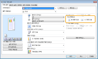 2 | 드라이버의 [기본 설정] 화면에서 [인쇄 방향]을 1단계에서 설정한 것과 같은 방향으로 설정합니다. |