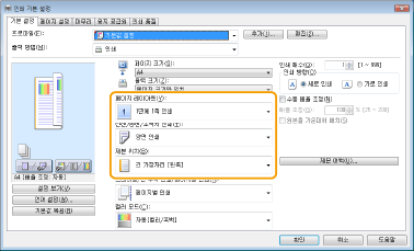 3 | 인쇄 미리 보기를 확인하는 동안 [페이지 레이아웃] [페이지 순서] [단면/양면/소책자 인쇄] [제본 위치]를 설정합니다. |