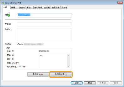 按一下 [一般] 標籤中的 [列印測試頁]。