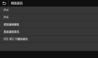 顯示本機 IP 位址等網路設定,以及無線區域網路通訊狀況等狀態。