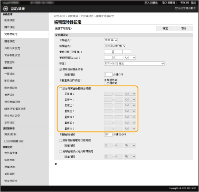 可以設定在一週當中每一天的固定時間自動關機。這樣能夠避免未關閉電源而浪費電力。預設會停用此功能。