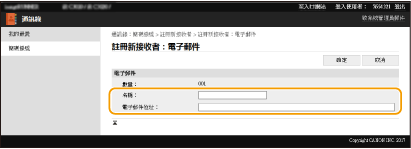 可以使用電腦在本機的通訊錄中註冊接收者,以及編輯已註冊接收者的資訊。請在此指定共用資料夾或 FTP 伺服器接收者。