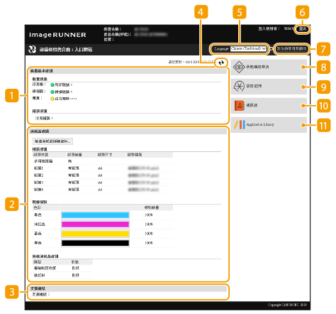 登入遠端使用者介面時,會顯示下列入口網站頁面。本節說明入口網站頁面中顯示的項目以及基本操作。