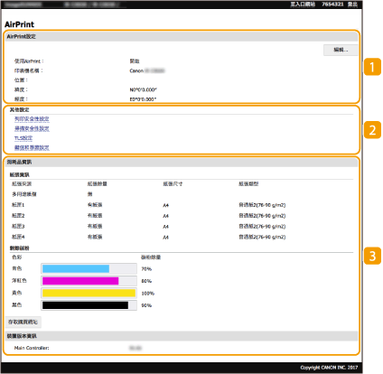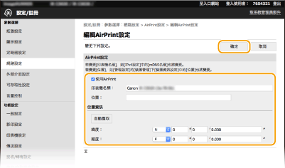 若您選擇 [使用AirPrint],下列在 <網路> 的設定會設為 <開啟>。<使用HTTP> <IPP列印設定> <使用mDNS> (IPv4) <使用mDNS> (IPv6) <使用Network Link Scan> |