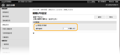 2 | 請根據需求指定設定。 ![]() [使用LPD列印] 勾選此核取方塊,即可透過 LPD 列印。若不使用 LPD 列印,清除此核取方塊。 [使用RAW列印] 勾選此核取方塊,即可透過 RAW 列印。若不使用 RAW 列印,清除此核取方塊。 [接收逾時] 設定一個值作為等待重新開始接收資料的時間。若未在設定時間內恢復資料接收,則會取消列印。 |