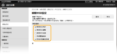2 | 請根據需求指定設定。 ![]() [使用WSD列印] 勾選此核取方塊,即可透過 WSD 列印。若不使用 WSD 列印,清除此核取方塊。 [使用WSD瀏覽] 勾選此核取方塊可透過 WSD 從電腦取得關於本機的資訊。勾選 [使用WSD列印] 核取方塊時,會自動勾選此核取方塊。 [使用WSD掃描] WSD 掃描可用於在不安裝掃描器驅動程式的情況下將文件掃描至電腦。請勾選透過 WSD 掃描文件的核取方塊。不使用 WSD 掃描時,請清除該核取方塊。 [使用電腦掃描] 勾選此核取方塊,即可透過用控制面板操作本機的方式使用 WSD 掃描。勾選 [使用WSD掃描] 核取方塊時,才能勾選此核取方塊。若要執行掃描,在首頁畫面中選擇 <掃描>,並指定一台已連接 WSD 的電腦作為掃描接收者(掃描並儲存至電腦)。 [使用多點傳送發現] 勾選此核取方塊,即可設定本機回覆多點傳送發現訊息。如果清除核取方塊,即使多點傳送發現訊息在網路上流動,本機仍會處於睡眠模式。 |