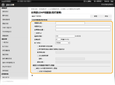 不論是針對搜尋或認證的註冊,LDAP 伺服器註冊是獨立的。若要使用 LDAP 伺服器搜尋傳真和電子郵件接收者,註冊用於搜尋,並將它用於認證電子郵件或傳真的傳送,註冊用於認證。
