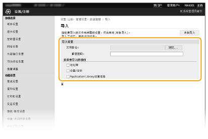 单击 [浏览] 然后选择文件。只能导入设备配置信息文件 (*.dcm) 和佳能地址簿文件 (*.abk)。如果选择佳能地址簿文件类型,则无需设置其他任何项目。
