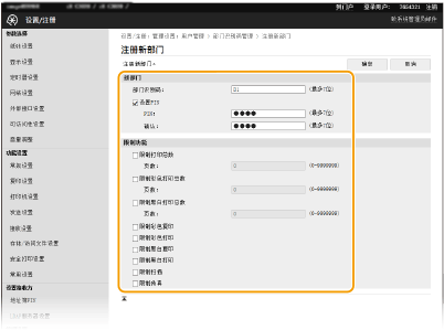 2 | 指定所需设置。 [部门识别码] 输入要注册的部门识别码数字。 [设置PIN] 若要设置 PIN,请选择此复选框,然后在 [PIN] 和 [确认] 文本框中输入相同的数字。 [限制功能] 可以限制要打印的页数以及要注册的部门的可用功能。如需限制要打印的页数,请选择目标类型的复选框,然后在 [页数] 中输入适当的页数。选择目标功能的复选框以限制功能。 如果选择了 [限制扫描] 复选框,将限制保存到 USB 存储设备、发送电子邮件以及保存到共享文件夹或 FTP 服务器这些功能。也可以通过将其导入到计算机来限制扫描文档的其他方式,但在这种情况下无法对每个部门识别码单独进行访问阻止 ( 当部门识别码未知时阻止作业)。 |