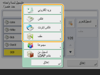 حدد <فاكس> أو <بريد إلكتروني> أو <فاكس إنترنت> أو <ملف> كنوع الوجهة الذي تريد تسجيله. تسجيل جهات الاتصال في دفتر العناوين
