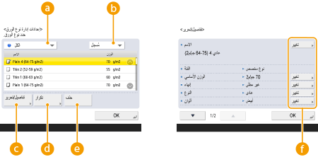 عندما تُسجِّل الإعدادات لنوع الورق المخصص، تأكد من تغيير اسمه. لا يمكنك تغيير إعدادات أنواع الورق الافتراضية المسجلة في الجهاز. |