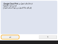 التسجيل من جهاز محمول أو Google Chromeويمكن تسجيل الجهاز باستخدام جهاز محمول أو Google Chrome. قبل اكتمال التسجيل، سوف تظهر شاشة التأكيد التالية على شاشة الجهاز. اضغط على <نعم> لإكمال التسجيل. لمعرفة معلومات عن طُرقِ التَّسجيل، راجع الدليل الخاص بجهازك أو الصفحة الرئيسية لخدمة Google Cloud Print. |