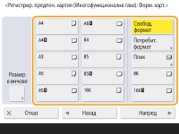 1 | Натиснете <Потребит. формат>. ![]() Можете да изберете размера на хартията като <Свободен формат>, което премахва необходимостта от въвеждане на настройките за размера на хартията. Задайте <Свободен формат>, когато зареждате хартия с неизвестен размер, която да се използва за копиране или когато размерът на хартията вече е регистриран в драйвера на принтера. |