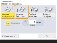 В зависимост от функциите за довършване, е необходимо инсталирането на допълнителни устройства. Опционални устройства В зависимост от типа хартия не можете да използвате функциите за довършване. Спецификации на хардуера Когато поставяте оригинал върху стъклото за документиНатискането на <Настройки> <Създаване на задача> върху екрана с основни функции за копиране ви позволява да използвате функцията Колиране/Групиране дори и ако оригиналът е поставен върху стъклото за документи.Вкарайте разделител на задачи между всяка страница по време на групово изкарванеАко изберете <Групиране (Еднкв. стр.)>, можете да вкарате разделител на задачи между всяка група. За повече информация вж. <Разделител на задачи между групите>. <Копиране> <Разделител на задачи между групите>При конфигуриране на настройки в <Достъп до запам. ф-ве>Можете да използвате функциите за довършване само ако печатате PDF/XPS файлове. |
