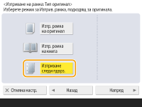 1 | Натиснете <Изтриване рамка ориг.> и задайте <Формат оригин.>. ![]() Ако размерът, показан в <Формат оригин.>, е различен от размера на оригинала, който сте задали, натиснете <Промяна> за избиране на размера. |