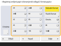 1 | Pritisnite <Vlastiti format>. ![]() Veličinu papira možete definirati kao <Slobodni format>, nakon čega ne trebate unositi postavku veličine papira. Odaberite postavku <Slobodni format> kad umećete papir nepoznate veličine za kopiranje ili ako je veličina papira već registrirana u upravljačkom programu pisača. |