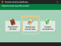 ![]() | Odredište koje se često upotrebljava praktično je registrirati u brzinskom gumbu. Na ovaj način jednostavnim pritiskom gumba možete brzo odrediti odredište. Osim što u brzinskom gumbu možete registrirati broj faksa ili adresu e-pošte, također možete registrirati i lokaciju mape datotečnog poslužitelja (IP adresu i put) koji će se upotrijebiti prilikom pohranjivanja skeniranih podataka. |