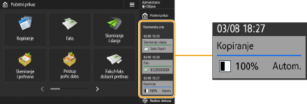 Vremenska crta praktična je funkcija za opetovanu primjenu istih postavki i odredišta za funkcije "Kopiranje", "Skeniranje i slanje" itd. Povijest upotrebe postavki automatski se dodaje vremenskoj crti. Crtu možete pritisnuti kako biste ponovno upotrijebili iste postavke.