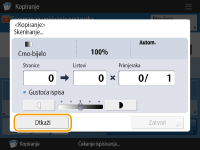 Ako pritisnete na upravljačkoj ploči dok se prikazuje zaslon s osnovnim značajkama kopiranja, zadatak kopiranja se pauzira i prikazuje se poruka <<Stop>Izaberite zadatak kopiranja koji želite otkazati.> i popis zadataka kopiranja. Morate odabrati zadatak kopiranja s popisa i otkazati zadatak tak da pritisnete <Otkaži>.Ako se prijavite upravljanjem osobnom autentikacijom i odjavite nakon pritiska na na upravljačkoj ploči da bi se prikazala poruka <<Stop>Izaberite zadatak kopiranja koji želite otkazati.> i popis zadataka kopiranja, otkazuje se posljedni zadatak kojeg je odjavljeni korisnik izvršio i nastavljaju se drugi zadaci. |