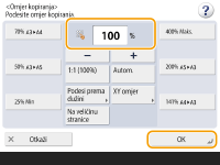 ![]() | Možete povećati ili smanjiti navođenjem omjera kopiranja (%). Možete individualno odrediti okomite i vodoravne omjere. Povećavanje ili smanjivanje kopija određivanje omjera kopiranja | |