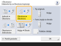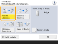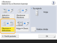 Za <Knjiga Obostrano> može se koristiti samo A4 papir.Postavite izvornike na kopirno staklo kada koristite <Knjiga Obostrano>. |