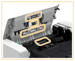 Ako se dogodi bilo koji od problema u nastavku kada se dokumente skenira iz ulagača, tada očistite ulagač. Nije moguće jasno skenirati dokument Nije moguće ispravno otkriti veličinu dokumenta Dokument postaje zaprljan tijekom skeniranja Papir se često zaglavljuje |