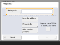 Bez obzira na postavljanje opcije <Format metode kriptiranja na FIPS 140-2> za IPSec komunikaciju, koristit će se modul za enkripciju s postojećim FIPS140-2 certifikatom. Kako biste osigurali usklađenost IPSec komunikacije sa standardom FIPS 140-2, u mrežnom okruženju kojemu uređaj pripada morate postaviti dužinu ključa za DH i RSA u IPSec komunikaciji na 2048 ili više bitova. S uređaja možete odrediti samo dužinu ključa za DH. Obratite pažnju prilikom konfiguriranja okruženja, jer uređaj ne sadrži postavke za RSA. Možete registrirati do 10 sigurnosnih pravila. |