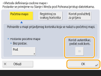 3 | Odaberite željene autentikacijske podatke i pritisnite <OK>. Želite li upotrijebiti zasebno korisničko ime i zaporku za osobnu mapu, pritisnite <Koristi autentikac. podat.svak.koris.> i dodajte kvačicu. Uklonite kvačicu želite li upotrijebiti isto korisničko ime i zaporku koje ste unijeli prilikom prijave. Ako ste toj stavki dodali kvačicu, za svakog korisnika morate registrirati korisničko ime i zaporku. ![]() U početnoj mapi izrađena je mapa sa sljedećim nazivima. Ako je uz opciju <Koristi autentikac. podat.svak.koris.> postavljena kvačica: korisničko ime koje je odredio korisnik Ako uz opciju <Koristi autentikac. podat.svak.koris.> nije postavljena kvačica: korisničko ime odabrano za prijavu |