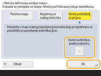 2 | Odaberite željene autentikacijske podatke i pritisnite <OK>. Želite li upotrijebiti zasebno korisničko ime i zaporku za osobnu mapu, pritisnite <Koristi autentikac. podat.svak.koris.> i dodajte kvačicu. Uklonite kvačicu želite li upotrijebiti isto korisničko ime i zaporku koje ste unijeli prilikom prijave. Ako ste toj stavki dodali kvačicu, za svakog korisnika morate registrirati korisničko ime i zaporku. ![]() ![]() Informacije o provjeri autentičnosti koje su potrebne za pristup osobnoj mapi (korisničko ime i lozinka) ne mogu se dohvatiti iz aktivnog direktorija. Ako odaberete <Koristi autentikac. podat.svak.koris.>, korisničko ime i lozinka za prijavu na uređaj pomoću provjere autentičnosti tipkovnicom registrirane su kao informacije za provjeru autentičnosti za pristup osobnoj mapi. ![]() Obavezno upotrijebite servis za prijavu koji podržava tu funkciju. Za više informacija kontaktirajte svog lokalnog ovlaštenog prodavača Canonovih proizvoda. Ako upotrebljavate korisničku autentikaciju, konfigurirajte mapu na lokaciji "homeDir", korisnički atribut u aktivnom direktoriju, u formatu "\\naziv hosta\staza mape". |