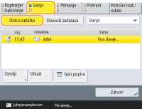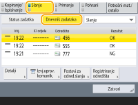 Pritiskanje <Detalji> <Ponovno slanje> omogućava ponovno slanje dokumenata koji nisu uspješno poslani/spremljeni. Za definiranje drugog odredišta pritisnite <Promijeni odredište>. Za dokumente s više odredišta definiranih da koriste istu metodu slanja/spremanja, pritisnite <Popis za razašiljanje>,odaberite odredište, a zatim pritisnite <Ponovno slanje> ili <Promijeni odredište>.Možete ponovno poslati dokumente kada je <Brisanje neuspjelih TX zadataka> postavljen na <Isključeno>. <Brisanje neuspjelih TX zadataka> Možete promijeniti odredišta dokumenata koja su postavljena za slanje/spremanje u određeno vrijeme kao i dokumenata koji nisu poslani/spremljeni. Ne možete mijenjati odredišta za dokumente s više odredišta koji se šalju/spremaju ili kada je ograničen unos novog odredišta (Ograničavanje novih odredišta). |