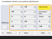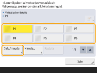 Kui menüü <Universaalaluse vaikeseaded> jaotises <Alati määra> on tehtud valik <Lemmikpaber>, saate kuvataval ekraanil valida „Lemmikpaberi“, kui asetate paberi universaalalusele. <Universaalaluse vaikeseaded> |