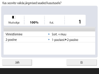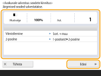 Isikliku nupu salvestamiseks peate olema sisse loginud isikliku autentimishalduse kaudu. Isikliku autentimise haldussätete konfigureerimine Kui valite <Sisselogimise autent. info> seadele <Faili SA/brausimise autentimiseks kasutatav info>, ei saa faili sihtkoha parooli salvestada isikliku nupuna. <Faili SA/brausimise autentimiseks kasutatav info> Teavet maksimaalse salvestatava isiklike ja jagatud nuppude arvu kohta vaadake teemast Haldusfunktsioonid. Isiklike nuppe ei saa muuta jagatud nuppudeks ja vastupidi. Selleks, et seda teha, taastage seaded ja salvestage uus nupp valikus <Menu>. Vajutage ja hoidke all nuppu, mille nime/kommentaari soovite muuta või mida soovite teisaldada/kustutada. Samu toiminguid (nime/kommentaari muutmine või nupu teisaldamine/kustutamine) on võimalik teha valikus <Menu> kuval <Avakuva>. Kuva <Avamenüü> kohandamine Isiklikke nuppe on võimalik jagada mitme seadme vahel, kui sünkroonite isikustatud andmed. Loend üksustest, mida on võimalik isikupärastada Isiklikele/jagatud nuppudele salvestatavad seadedIsiklikele/jagatud nuppudele salvestatavad funktsioonid ja seaded on loetletud allpool. Seaded, mida saab salvestada valikus <Lemmikseaded> seadele <Paljundamine> funktsioonile Paljundamistoimingute vähendamine <Faks> seadme funktsiooniseaded Faksi saatmise põhitoimingud Seaded, mida saab salvestada valikus <Lemmikseaded> seadele <Skaneeri ja saada> funktsioonile Kasulikud skannimisfunktsioonid Seaded, mida saab salvestada valikus <Lemmikseaded> seadele <Skaneeri ja salvesta> funktsioonile Ekraani ja toimingute seadmine skannimiseks salvestamiseks Salvestage funktsioonide <Skaneeri ja salvesta> ja <Juurdepääs failidele> asukohad valikus Salvestusruumi kasutamine Funktsiooni <Faksi/I-faksi postkast> põhifunktsioonide kuva otseteed Juurdepääsu serverisse ja sisselogimise parooli on võimalik salvestada isikliku/jagatud nupuna. See on mugav parooli sisestamise vahelejätmiseks, kui taastate salvestatud nupu. Kui soovite seada parooli registreeritud nupus salvestatud seadetele, sest importide isikliku või jagatud nupu seadeid teisele seadmele ja tahate takistada kasutajatel teise kasutajana esineda, jätke registreerimisel parool ära. Registreeritud nuppude import/eksportRegistreeritud isiklikke/jagatud nuppe saate importida ja eksportida Remote UI (kaugkasutajaliidese) kaudu. Kõigi sätete import/eksport Isikliku/jagatud nupuna Importida/eksportida saab imageRUNNER ADVANCE seeria seadmete isiklikke/jagatud nuppe, millel on kiirmenüü funktsioon. |