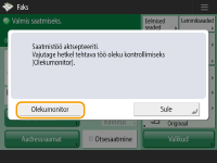 Prinditud lehekülgede koguarvu kontrollimiseks.Määratud sihtkohtade koguarv kuvatakse ekraani allservas. Nii saate enne saatmist kontrollida, et sihtkohtade arv oleks korrektne. ![]() Koos saatjainfoga saatmiseksSaate dokumente saata ka koos saatja nime ja faksinumbriga. <Saatva seadme tunnus> Saadetud dokumentide oleku vaatamineEkraanil <Oleku monitor> saate kontrollida saadetud dokumentide olekuid. Sellel kuval saate fakse uuesti saata või pärast olekute kontrollimist saatmise tühistada. Saadetud ja vastuvõetud dokumentide oleku ja logi kontrollimine Kui sätte <Kuva märguanne töö aktsepteerimisel> väärtuseks on seatud <On>, saate kuva <Oleku monitor> kuvada saatmistöö saamise järel kuvataval ekraanil. <Kuva märguanne töö aktsepteerimisel> ![]() Kui esineb sidetõrge, sest vastuvõtja liin on hõivatud.Masin valib numbri kindla aja möödudes automaatselt uuesti. Saate muuta saatmisega seotud sätteid, näiteks määrata uuesti valimise kordade arvu ja uuesti valimiste vahelise aja. <Automaatne kordusvalimine> Saatmistulemuste raporti printimineKui vajutate faksi põhifunktsioonide menüüs valikul <Valikud> <Saatmise tulemuse aruanne>, saate määrata, et saatmistulemuste raport tileb automaatselt printida.Selleks, et määrata see säte kuval <Valikud> kõigi tööde jaoks, peate tegema valiku <Ainult vea korral> või <Väljas> kuval<Saatmise tulemuse aruanne> ja seejärel määrama seade <Luba printimine lisavarustuse abil> väärtuseks <Sees>. Kui määratud on mitu telefoniliiniSaate valida telefoniliini, mida faksimiseks kasutatakse, kui vajutate <Valikud> <Liini valik>. Lisainformatsiooni faksiliini seadete määramise kohta leiate osast lõigustFaksi liini seaded. |