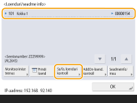 Vajutage <Monitoorimise teenus> <Side test>, et kontrollida sidet kaugjälgimisserveriga. Kui see funktsioon on käivitatud, saadetakse seadmest teavet regulaarselt kaugjälgimisserverisse. Selle funktsiooni kasutamiseks on vaja lubada side seadme ja teenust pakkuva serveri vahel.Saate printida loendi, kus kuvatakse kopeerimiseks, printimiseks, skannimiseks ja faksimiseks kasutatavate lehtede arv. Samuti saate kontrollida iga AddOn loenduri teavet. Vajutage ekraanil 2. sammus nuppu <AddOn-loend. kontroll>. Kui vajutate samal ekraanil <Seadmeinfo/muu> <Seadme konfiguratsioon>, saate kontrollida masinasse installitud suvandeid.Loendimistingimuste kohta pöörduge Canoni kohaliku volitatud edasimüüja poole. |