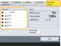 Paberiummistus ei pruugi tegelikult olla kontrollitavas asukohas. Järgige sellegi poolest kuvatavaid juhiseid ja kontrollige kõiki asukohti. Ekraanil kuvatakse korduvalt juhiseid paberiummistuse kohta, kuni ummistus on likvideeritud. Kui vajutate paberiummistusest teavitaval kuval nuppu <Sule>, siis võite saada printerit edasi kasutada ja seadeid muuda ilma, et paberiummistus oleks vaja kohe likvideerida. Ärge eemaldage paberit muust kohast peale kuvatava paberiummistuse koha. See võib põhjustada paberiummistusi muudes kohtades või jätta vahele lehti väljastatavatest dokumentidest. |