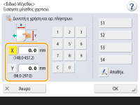 Πατήστε <X> ή <Y> για να εισαγάγετε το μήκος κάθε πλευράς, χρησιμοποιώντας τα αριθμητικά πλήκτρα. ![]() Αν καταχωρήσετε το μέγεθος του χαρτιού που χρησιμοποιείτε συχνά στα πλήκτρα <S1> έως <S4>, μπορείτε να τα εμφανίζετε με το πάτημα ενός πλήκτρου. Καταχώρηση χαρτιού ελεύθερου μεγέθους (Χαρτί προσαρμοσμένου μεγέθους) | |