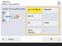 1 | Πατήστε <Φάκελος>. Ο τύπος χαρτιού φακέλου δεν μπορεί να επιλεγεί από την οθόνη λεπτομερειών του <Τύπος Χαρτιού>. Για να επιλέξετε τύπο χαρτιού φακέλου, καταχωρήστε τον τύπο χαρτιού στο <Αποθήκευση Αγαπημένου Χαρτιού (Δίσκος ΠΧ)> και, στη συνέχεια, πατήστε <Αγαπημένο Χαρτί> στο βήμα 2 και το κουμπί στο οποίο έχει καταχωρηθεί ο τύπος χαρτιού φακέλου <OK>. Καθορισμός συχνά χρησιμοποιούμενου μεγέθους και τύπου χαρτιού για τον δίσκο πολλαπλών χρήσεων |