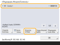 Πατήστε <Υπηρεσία Εποπτείας> <Δοκιμή Επικοινωνίας> για να ελέγξετε την επικοινωνία με τον απομακρυσμένο διακομιστή παρακολούθησης. Όταν εκτελείται αυτή η λειτουργία, στέλνονται περιοδικά πληροφορίες για τη συσκευή στον απομακρυσμένο διακομιστή παρακολούθησης. Είναι απαραίτητο να ενεργοποιήσετε την επικοινωνία μεταξύ της συσκευής και του διακομιστή που παρέχει την υπηρεσία, προκειμένου να χρησιμοποιήσετε αυτήν τη λειτουργία.Μπορείτε να εκτυπώσετε μία λίστα που εμφανίζει τον αριθμό των σελίδων που χρησιμοποιήθηκαν για την αντιγραφή, εκτύπωση, σάρωση και αποστολή φαξ. Μπορείτε επίσης να ελέγξετε τις πληροφορίες του μετρητή για κάθε εφαρμογή AddOn. Πατήστε <Έλεγχος Μετρητή AddOn> στην οθόνη στο βήμα 2. Εάν πατήσετε <Πληροφορίες Συσκ./Άλλα> <Διαμόρφωση Συσκευής> στην ίδια οθόνη, μπορείτε να ελέγξετε τις επιλογές που έχουν εγκατασταθεί στη συσκευή.Για πληροφορίες σχετικά με τις συνθήκες καταμέτρησης, επικοινωνήστε με ένα εξουσιοδοτημένο μεταπωλητή προϊόντων Canon. |